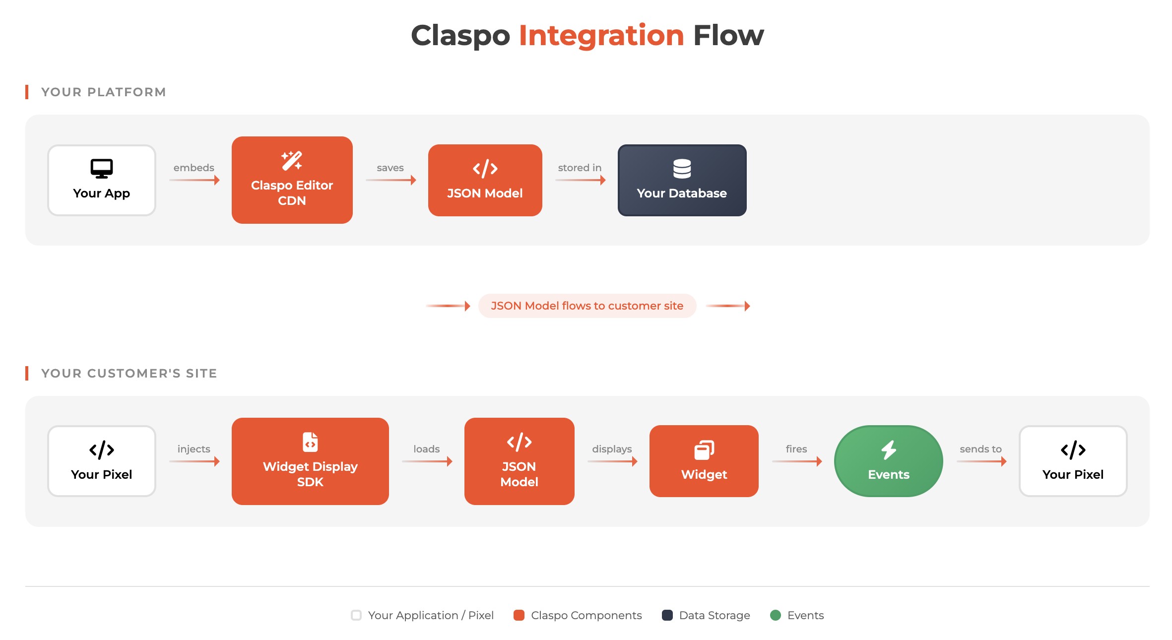 - User opens Claspo Editor, designs widget, saves JSON (Appearance Model)